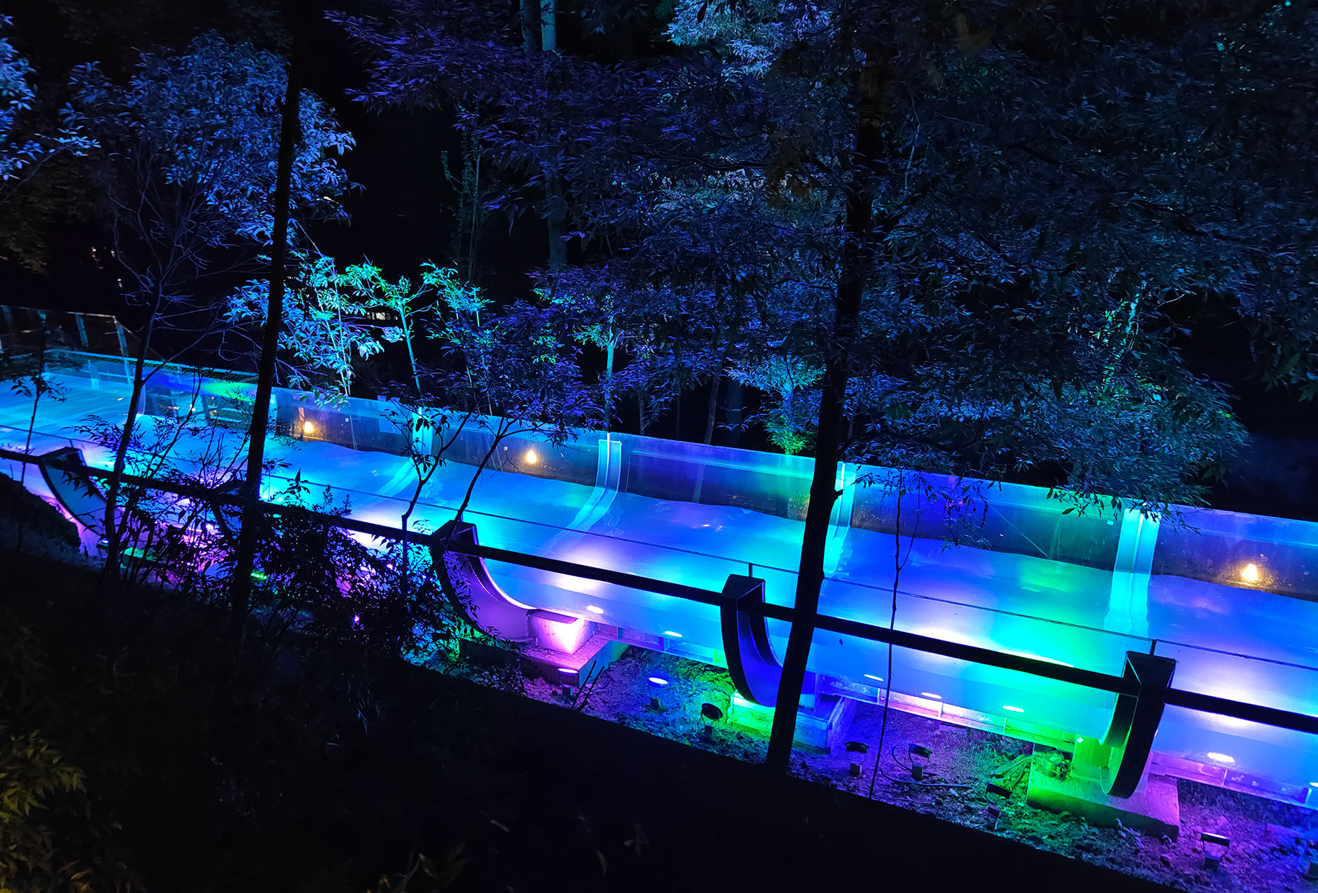 森林温泉区以森林玻璃温泉水道森林玻璃温泉水道、七彩森林温泉池、高品质硫磺原汤池及富含多种矿物质的山泉池组成;